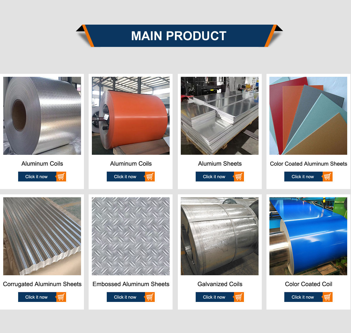 Main categories: Aluminum coil, Aluminum sheet, Color-coated aluminum coil, Galvanized coil, Color-coated coil